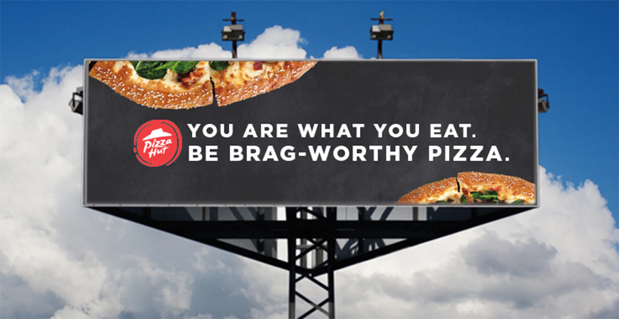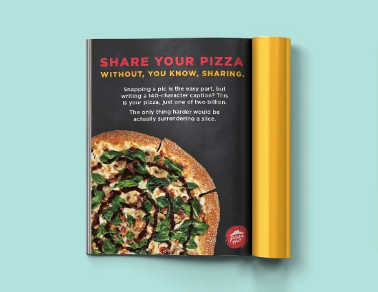 As the end of our campaign continues to celebrate adventurous eaters, Pizza Hut will create print and billboard ads that capture one of the largest challenges of being a connoisseur: sharing. When customers create one of 2 billion possible pizzas, they want to own it. They don’t want to surrender a slice of their masterpiece to a friend, but may choose to brag about it on their social media accounts. Unfortunately, pizza lovers that forgo actual sharing will discover a challenge; many social channels, such as Twitter, only allow users to post extremely short messages. For the Pizza Particular, a 140-character caption just isn’t going to cut it.