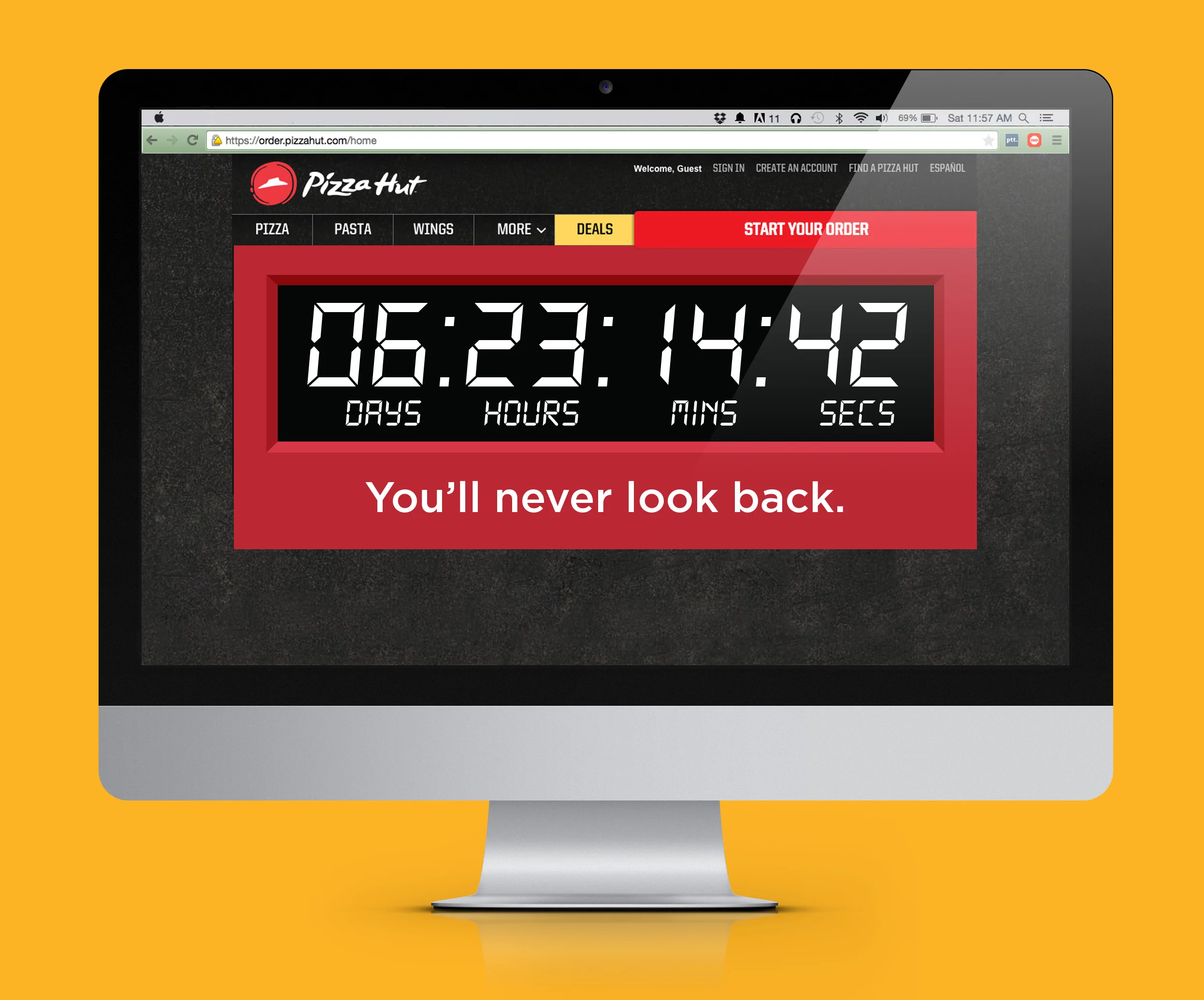 Several weeks into our campaign, a mysterious Countdown Clock will appear on PizzaHut.com with nothing but the words “You’ll never look back.” The timer will generate word-of-mouth and social buzz as pizza lovers can only guess what Pizza Hut is plotting. As the month goes on, the Countdown Clock will be further supported by Pizza Hut’s social media accounts and banner ad placements. This will drive users back to the website several times to check on the countdown. As promised, when that clock hits zero, Pizza Hut has massive news.